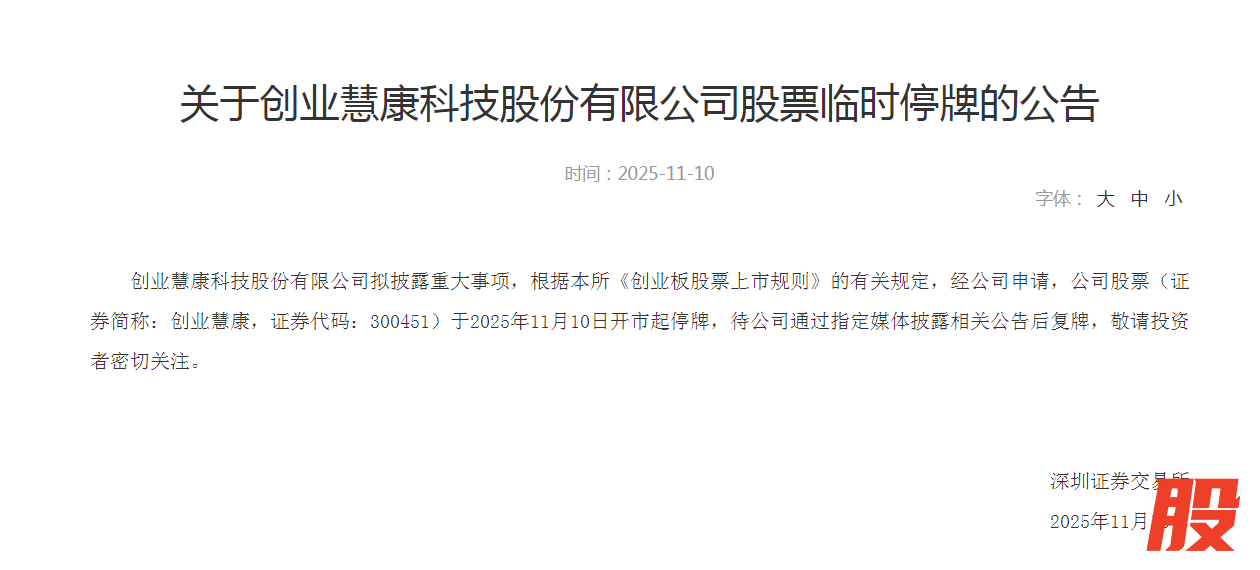 11月10日,深交所公告,创业慧康(300451)拟披露重大事项,公司股票于2025年11月10日开市起停牌,待公司通过指定媒体披露相关公告后复牌。