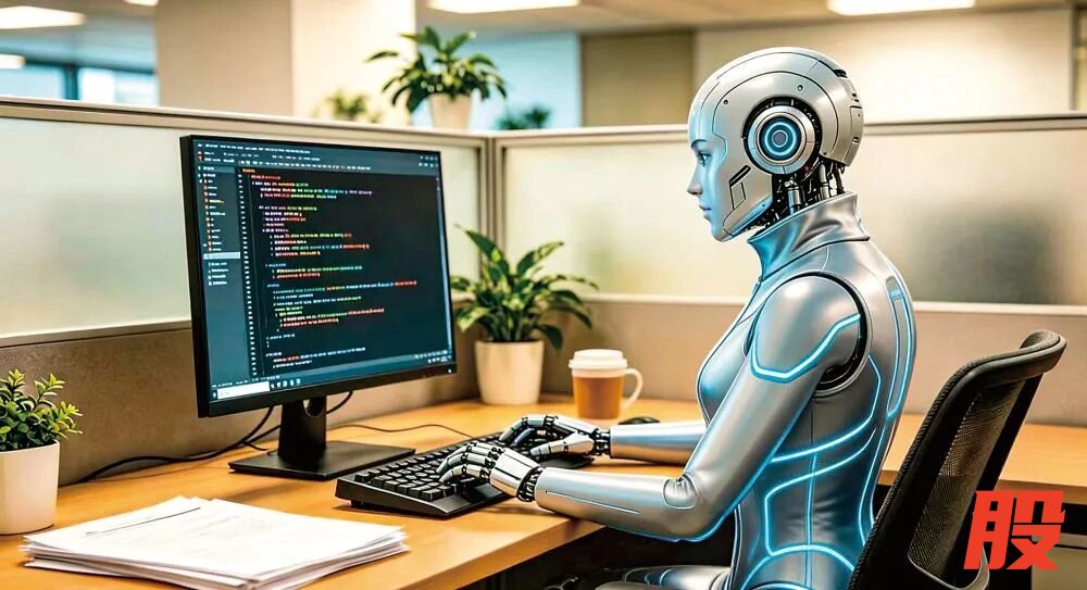 人工智能机器人正在电脑前工作。(AI生成图片)